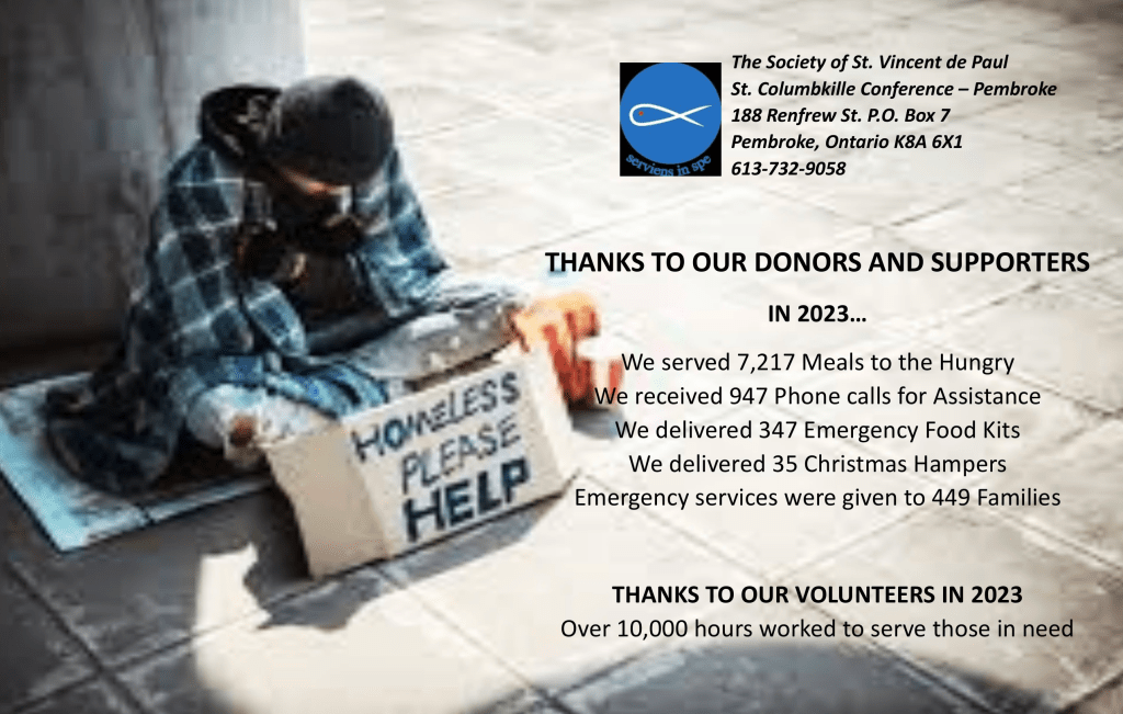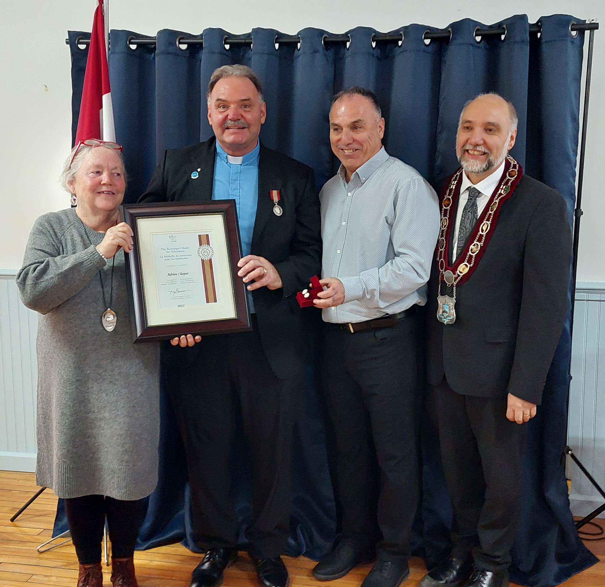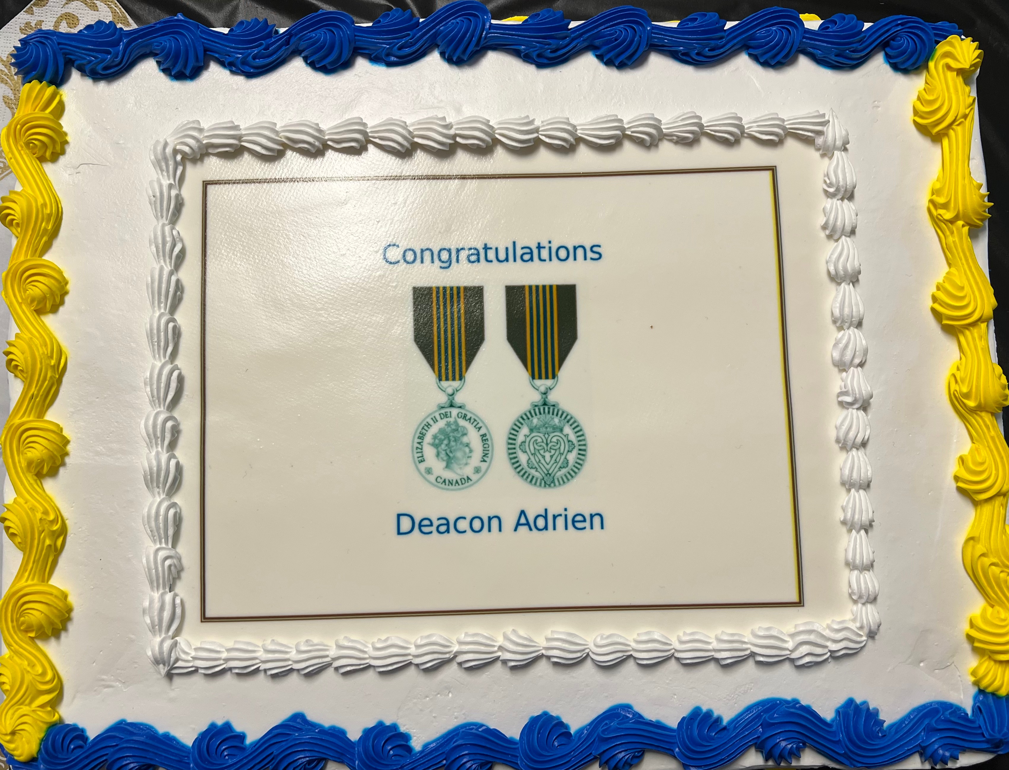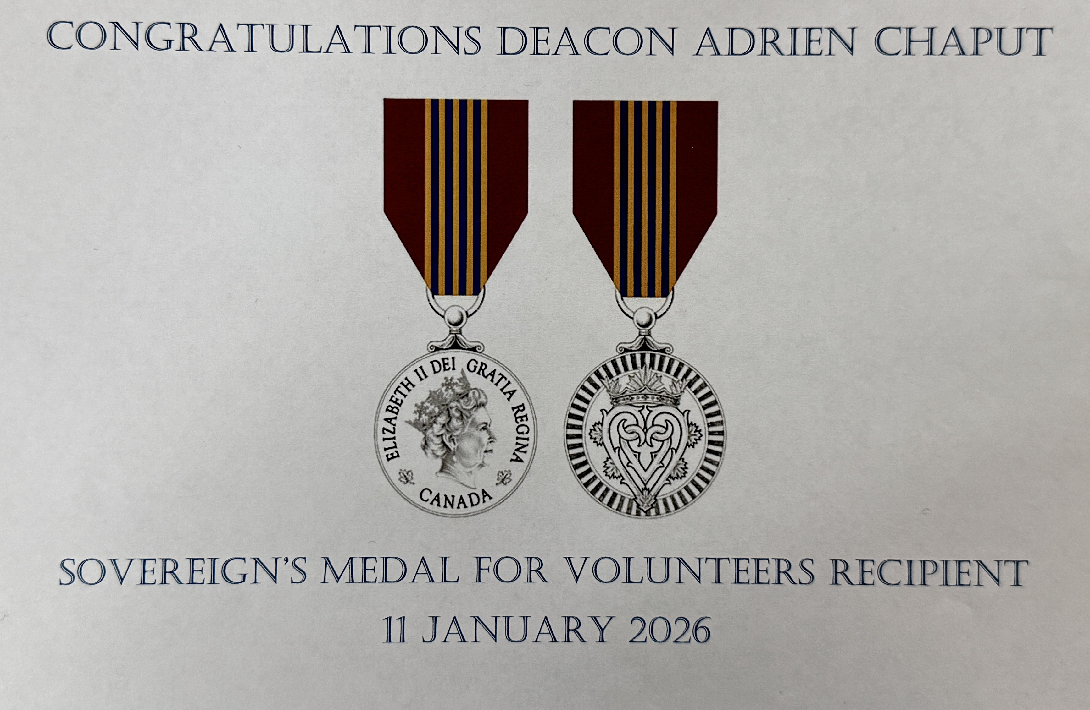 Her Excellency the Right Honourable Mary Simon Governor General of Canada, has awarded the Sovereign’s Medal for volunteers to Deacon Adrien Chaput for his tireless efforts on the behalf of the most vulnerable in our community, especially in respect to his work and leadership with The Society of Saint Vincent de Paul and the Grind)
