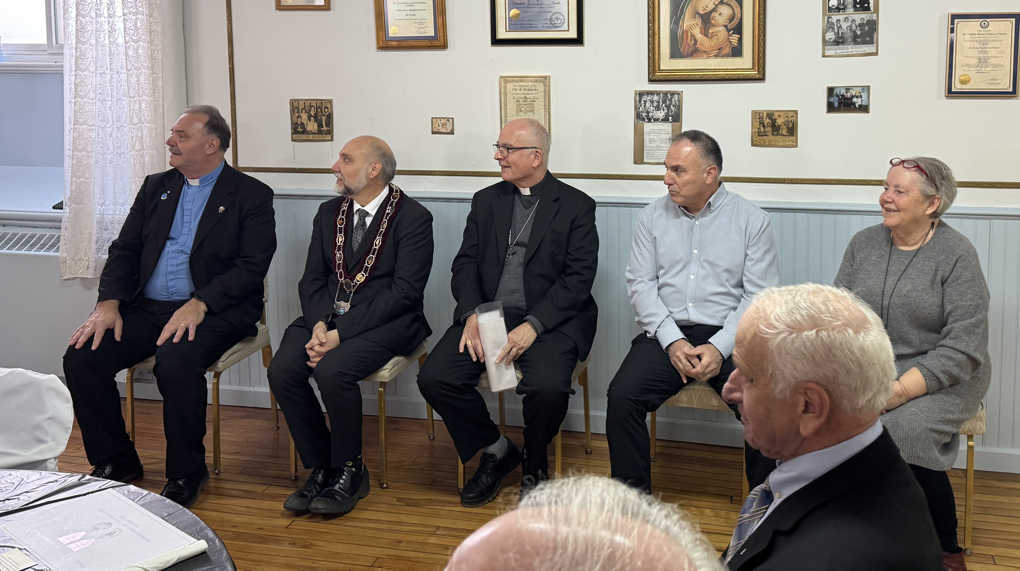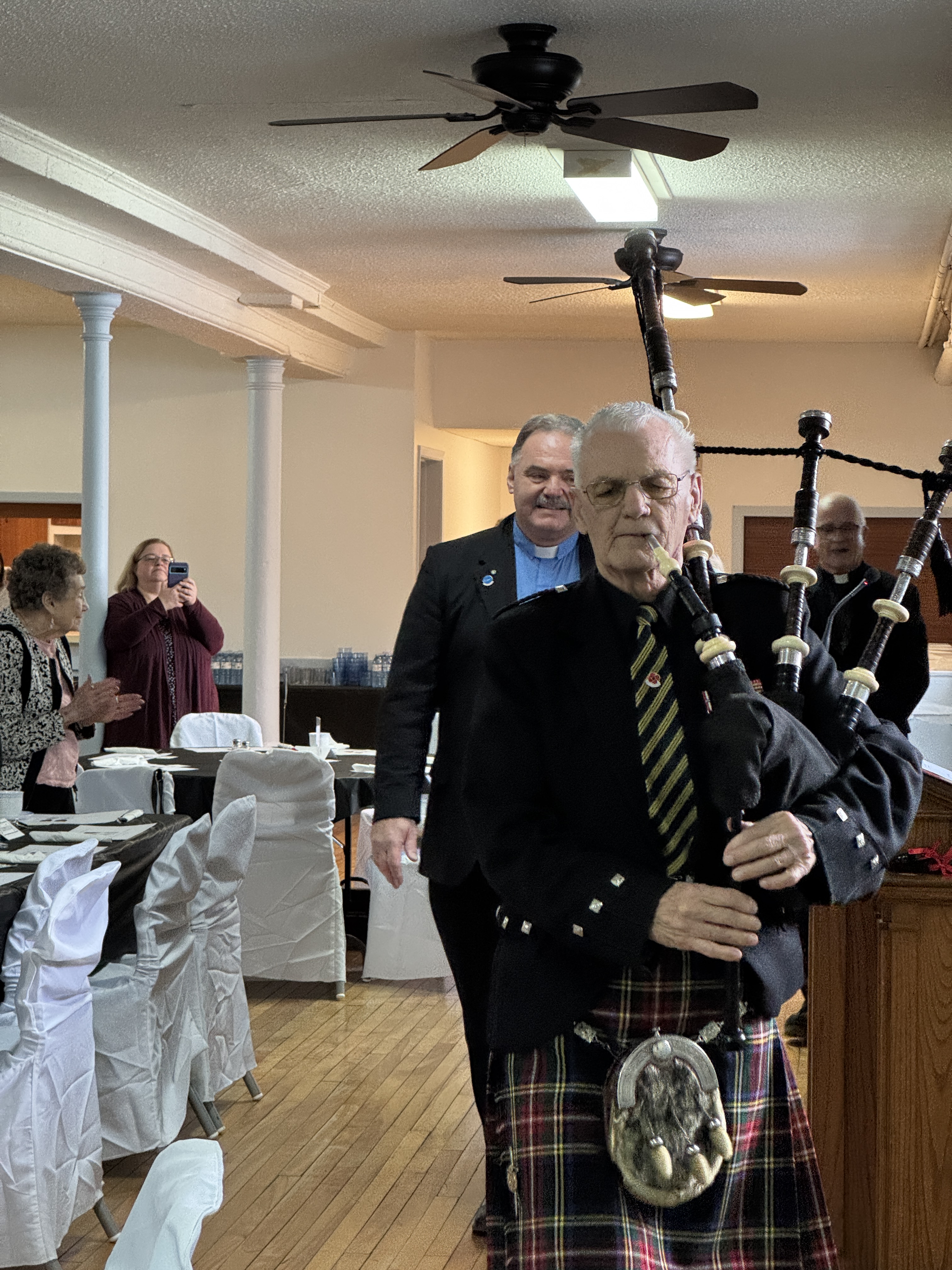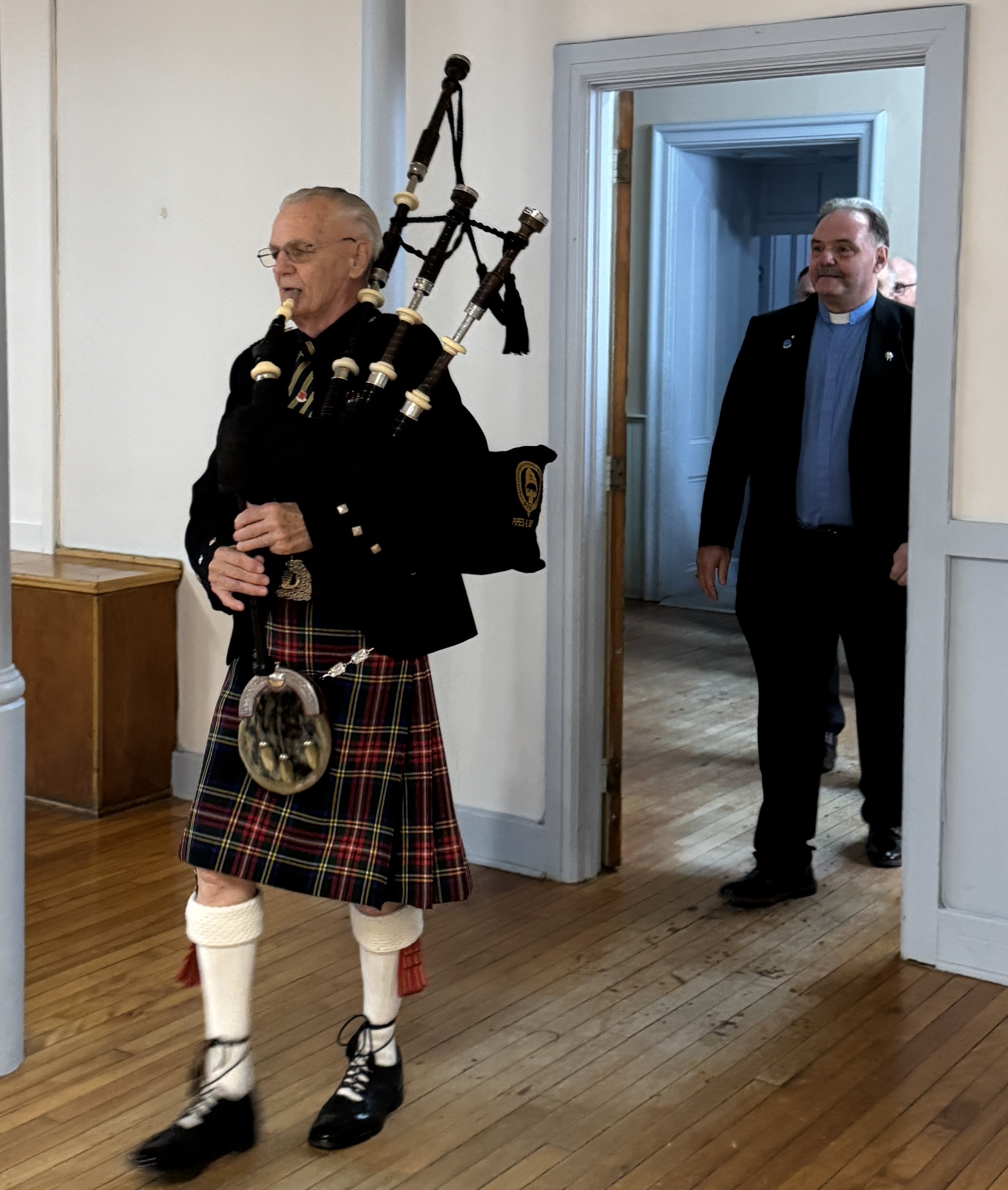 Piper Joe escorted in Deacon Adrien and distinguished guests (Sitting, from left to right: Deacon Adrien Chaput, Mayor Ron Gervais, Bishop Michael Brehl, Jerry Novack for The Grind, Muggsie Boland for Society of Saint Vincent de Paul and from the side Fred Blackstein, a devoted senior volunteer)