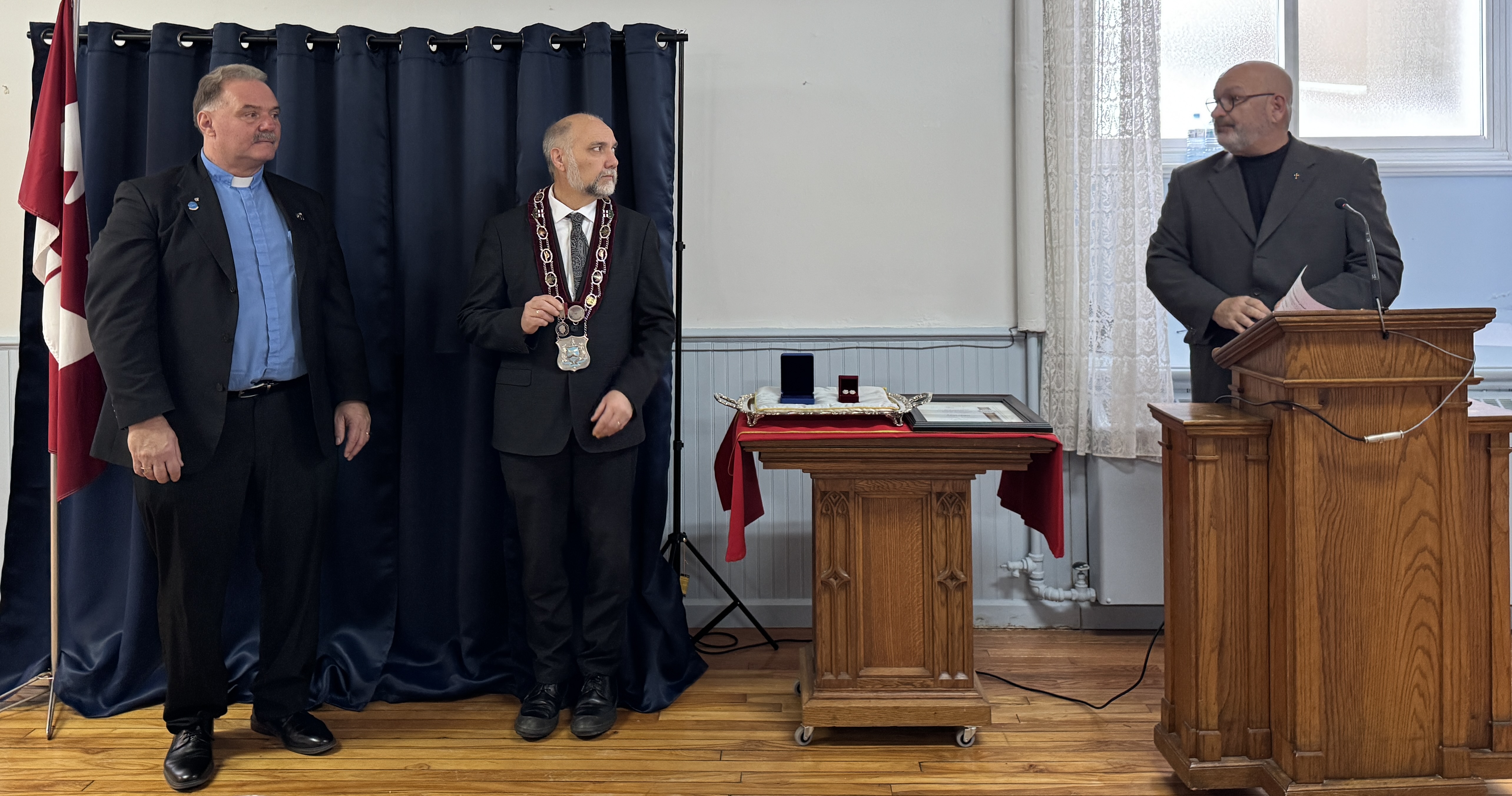Mayor Ron Gervais presented the medal to Deacon Adrien Chaput (Lance Patriquin served as master of ceremony)